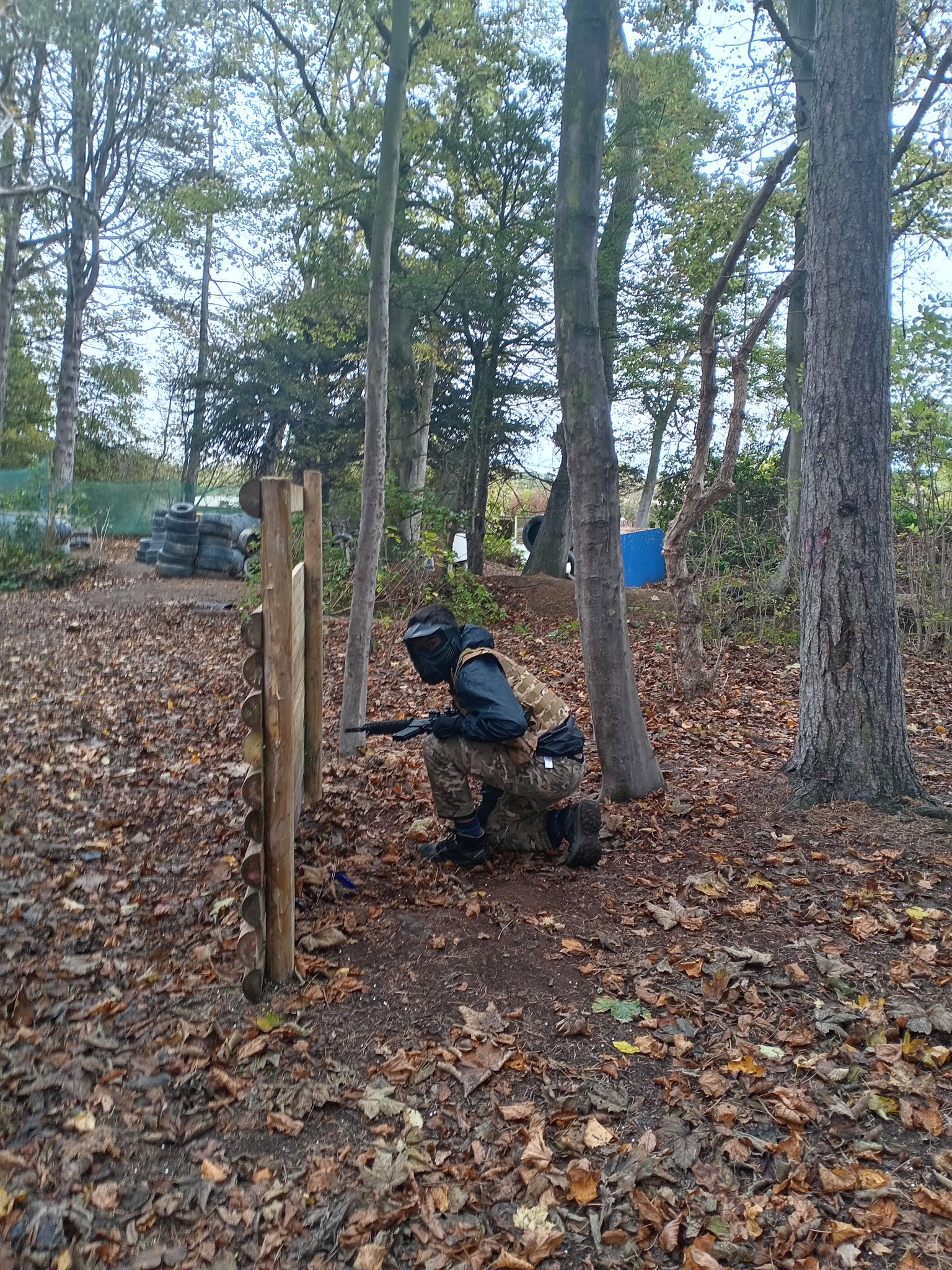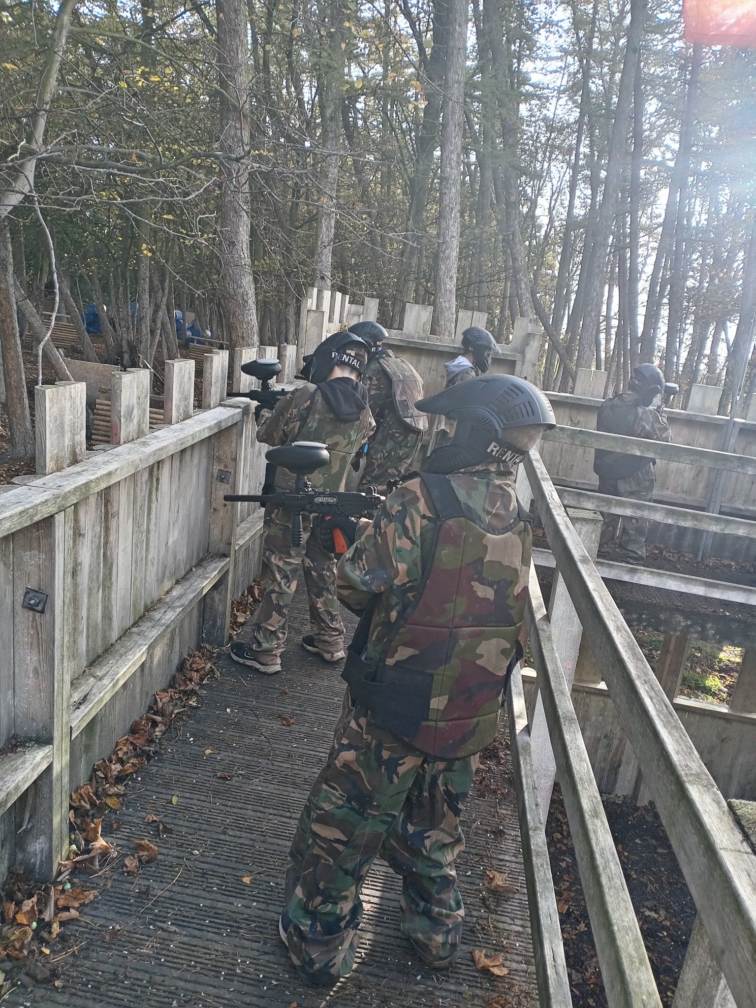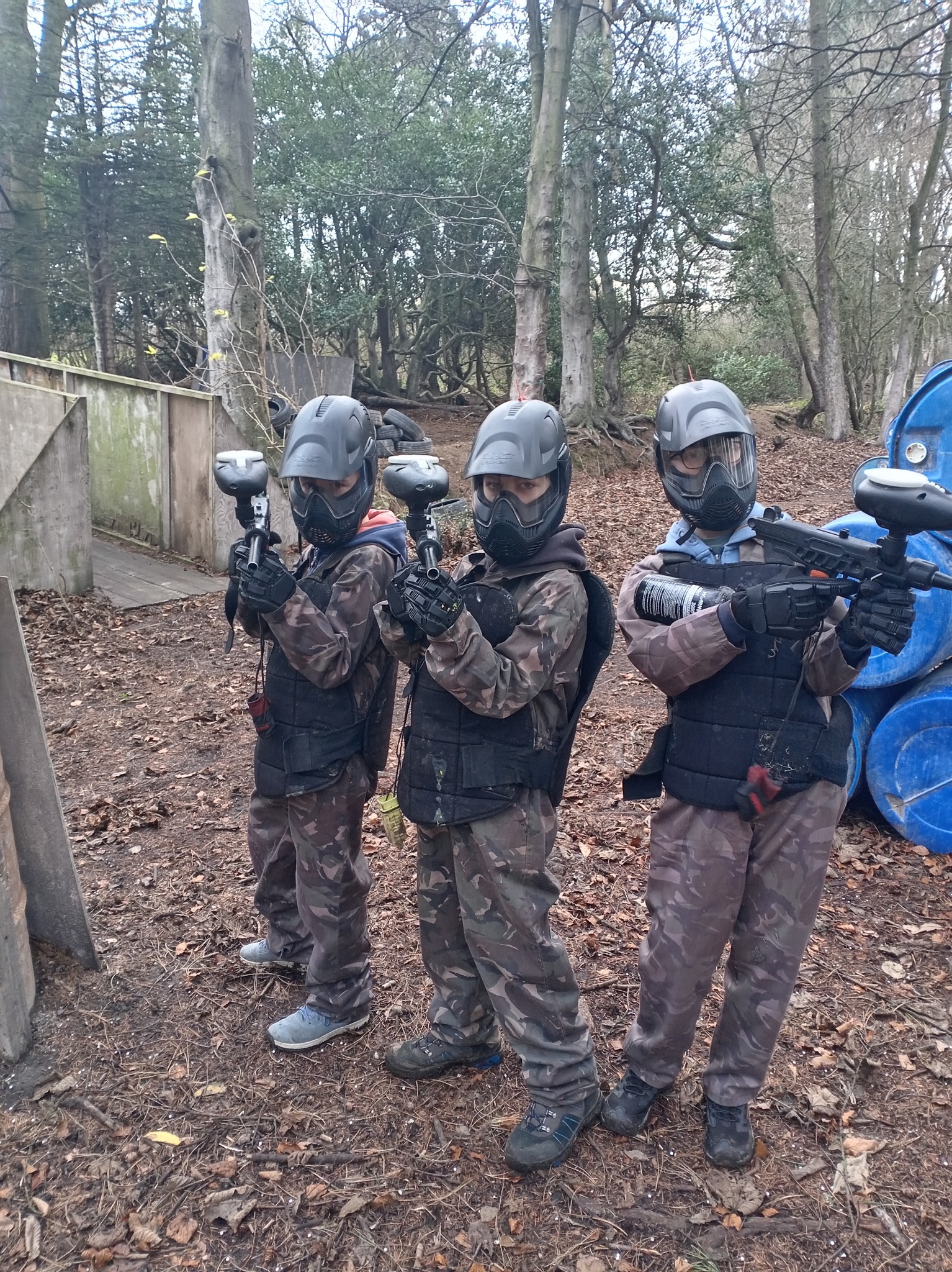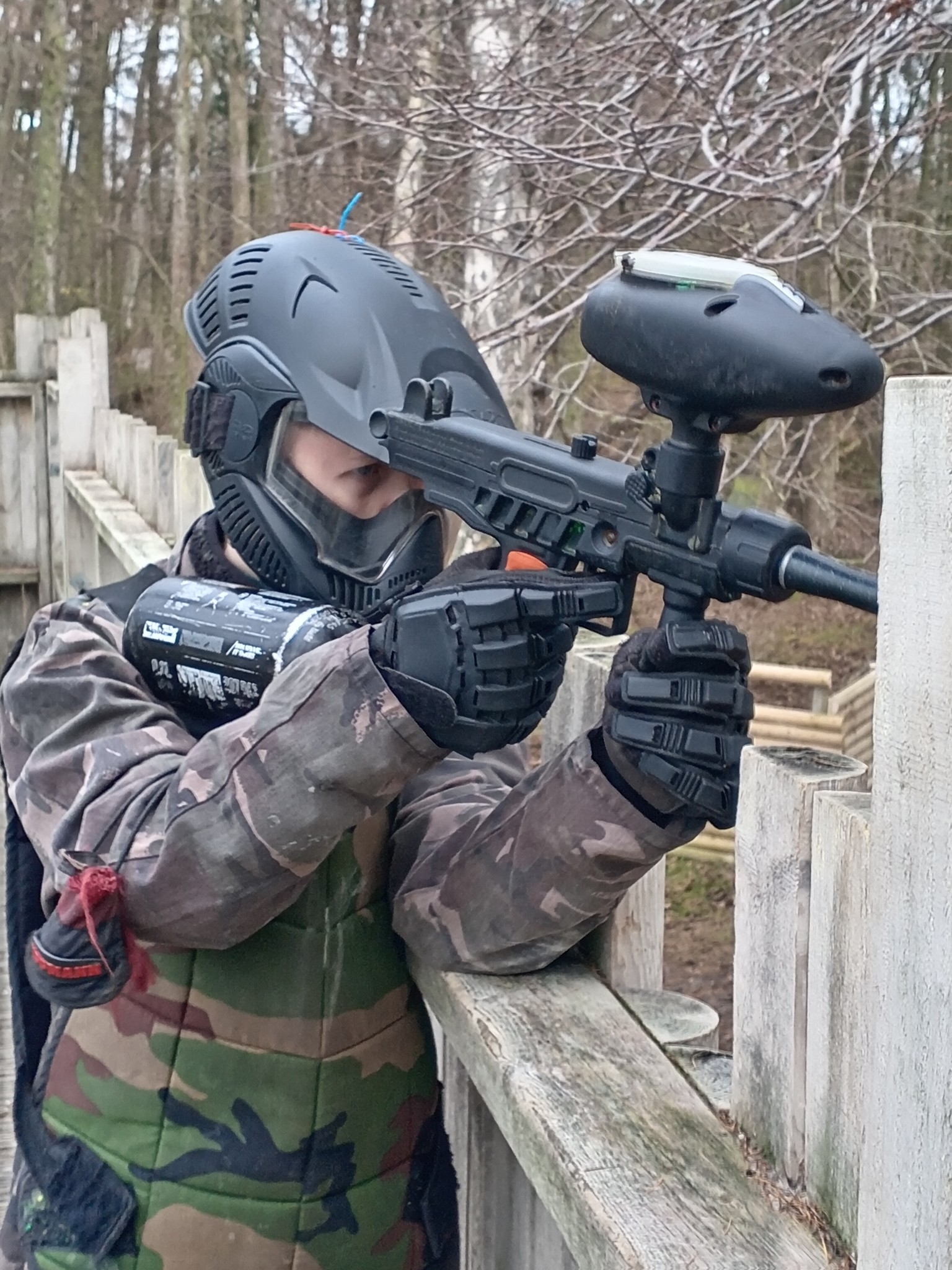 We provide overalls so your clothes don’t get covered in paint. So wear whatever’s comfortable. You might be tempted to wear a lot of layers, but this will only make you sweat more, and potentially steam up. You should wear old shoes as it will be muddy, even in summer. Walking boots are ideal for grip. We would also recommend gloves, though we do also sell these on site for £5 per pair. A hat would also be recommended to take the sting out of shots on the top/back of the head.